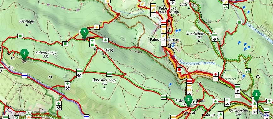 Novemberi túránk a Két-Bükkfa-nyeregtől (1) indul, ahonnan könnyű gyaloglással eltalpalunk a Pilis-nyereg (2) irányába. Ott szusszanunk egy kicsit, majd folytatjuk utunkat a Fekete-hegyi Berda József kulcsosházhoz (3) (Sasfészek). Miután a hangulatos turistaszálláson kigyönyörködtük magunkat a kilátásban, egy óvatos ereszkedés, majd egy kaptató megmászása után megérkezünk a Kétágú-hegyre, ahol az ország talán legszebb kilátását nyújtó pontjára érkezünk (4). Többek között a teljes Dorogi-medencére, a Vértesre, a Gerecsére nyílik panoráma, ami kárpótol minket a fáradalmakért. A szirt a siklóernyősöknek is kedvelt helye, reméljük, a novemberi időjárás is kegyes lesz hozzánk. A hegyről leereszkedve a zöld sáv jelzésen visszaérkezünk a Pilis-nyeregbe (2), majd onnan a túra kiindulópontjához a Két-Bükkfa-nyereghez (1).